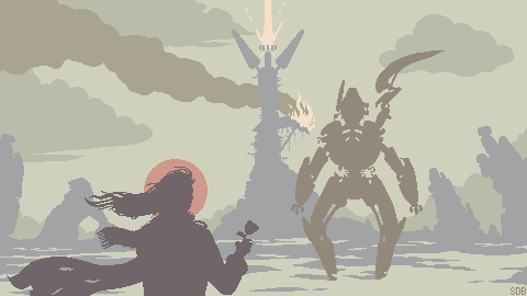 Yeah, I doubt I fooled anyone but this is an homage to amberMechanic's great Giant Robot pieces: Giant Robot Drama and Giant Robot Finale. They were made for a weekly competition where you had to only use silhouettes but, as rogue_frog said on the latter piece, they were also very much in her style. I am also referencing Partisans with the foreground character's clothing.