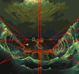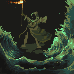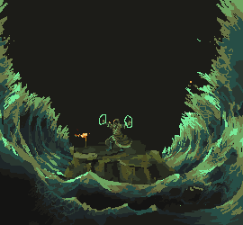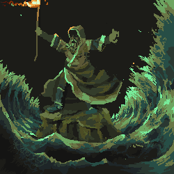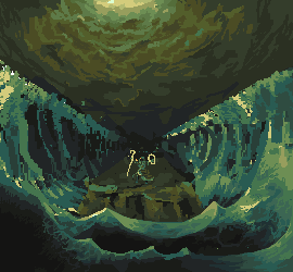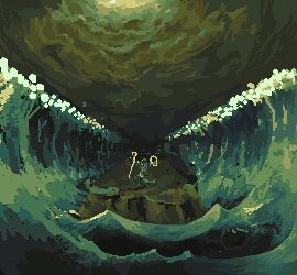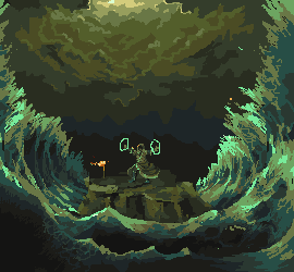 1. Your waves are breaking perspective. We're looking down at the sprite/land mass, and it seems like we're looking up at the waves. Also, the way they're framing the piece is aesthetically unappealing. You can use the waves to pull attention in towards the sprite by lowering the crests and making them extend further behind the sprite. 2. Your clouds are really ominous, but this piece shouldn't be ominous. The character is using the power of God to do this, right? So wouldn't it be at least a little bit... brighter? The palette and how you have arranged them scream dark/evil magic. They also look very unnatural and evil. I can't adjust the palette because I'm on a laptop without any good programs for that. (Just MS Paint, not the best for palettes :p) So I did what I could, which is to bring some light down. I'd say you could even go further and make a beacon of light shine down on the character.