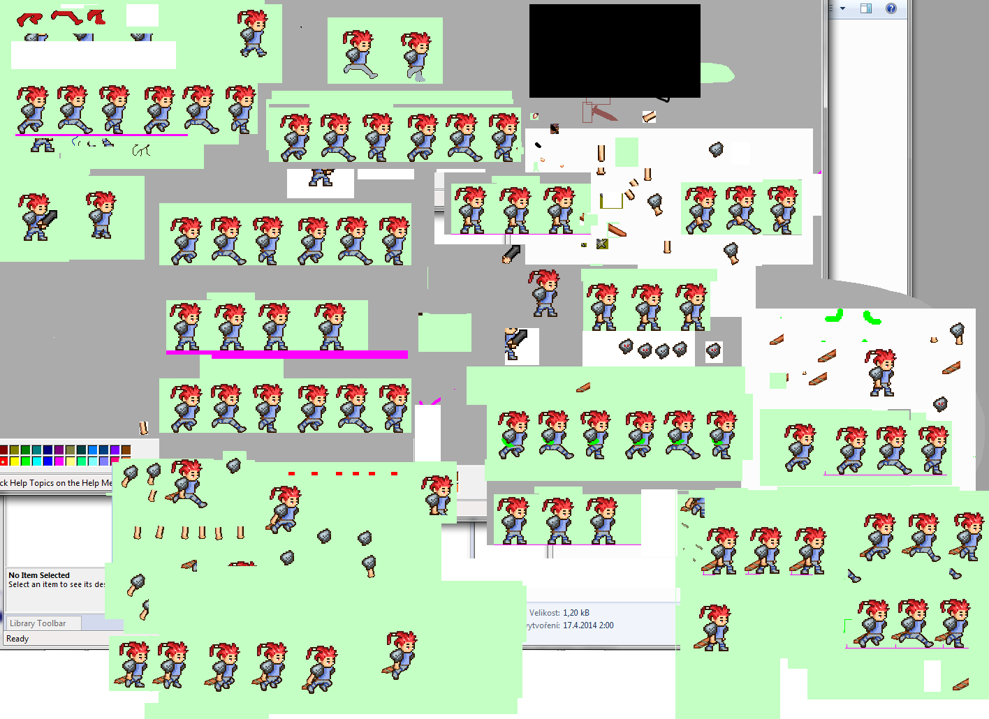 it has a built in palette manager so why use blobs? Layers are nice, but note how they cause you to accidentally floodfill the canvas instead of just the tree trunk? 1) I use blobs because I m used to them from MS Paint ( I used MS paint for years, I am using gale for 8 months); even GG has built in palette manager, I will still go for blobs. Force of habit. 2) Yes, it happens. Then I have go to ctrl+z. This is (heck) don't judge it please. My first hume sprite I ever created (in MS paint) before I got Gale. http://4.bp.blogspot.com/-3W6QRm3gEc8/VMALcoJN_iI/AAAAAAAABzo/fjRD7BvYaLU/s1600/__Quick_EDO.png I did game in 800x400 back then and I didnt know pixelart has some things to follow(pixel size,shadows,lights... etc.) I was lost without PJ and I looked at a lot of pixel sites. Sprite was based on based on http://www.raywenderlich.com/14865/introduction-to-pixel-art-for-games Then I got graphics Gale and I could do this animation on frames. not to MS sheet it like before (viz. pic). That's why I started to like it more than MS paint. For starters I would recommend something more flexible over Ms paint. I am still using paint XP for quick selection (from old times when I edited stuff) as I find this the fastest tool for "Select" tool. I would not recommend MS paint windows7 tho. But it's anyone's choice. If you're good with it and you can do crazy stuff (in a good way - nicepixelart) in it, why not. If I would be used to MS paint I would not trade either. Edited by RebeaLeion - 21 January 2015 at 12:37pm |
