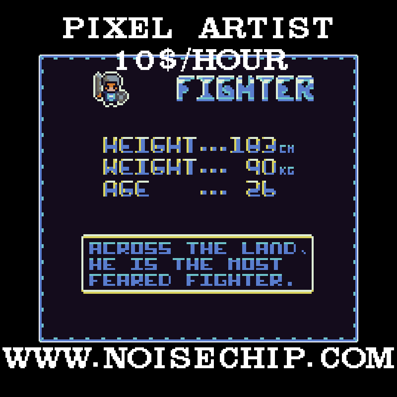 Hello, my name is Alejandro, I am a generalist pixel artist. I worked as Freelancer since 2022, I can do anything except isometric art. Mr rate is 10$ per hour. This is my Portfolio: https://noisechip.com/ Here you can see art of games completed: Long Term Projects Feel free to contact me anytime: •Reply to this post. •Send me a private message. •Reach me on discord: noisechip •Contact me by mail: noisechipfreelancer@gmail.com I do only accept payments via PayPal. Thank you! Here some more examples of my work: ![]() ![]() ![]() ![]() ![]() ![]() ![]() ![]() ![]() ![]() ![]() ![]() ![]() ![]() ![]() ![]() ![]() ![]() ![]() ![]() ![]() ![]() ![]() ![]() ![]() ![]() ![]() ![]() ![]() ![]() ![]() ![]() ![]() ![]() ![]() ![]() ![]() ![]() ![]() ![]() ![]() ![]() ![]() ![]() ![]() ![]() ![]() ![]() ![]() ![]() ![]() ![]() ![]() ![]() ![]() ![]() ![]() ![]() ![]() ![]() ![]() ![]() ![]() ![]() ![]() ![]() ![]() ![]() ![]() ![]() |