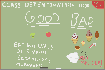 Also, it doesn't seem to make sense that there would be those colour drawings on the blackboard as well, even if its colour chalk, there's only quite limitted, bright colours possible.