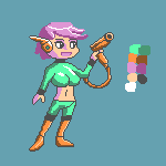 about the art itself i think ur palette needs refinement. u have too much colors ( the palette u put down even hasnt got all the colors used in it...) ur ramps are too linear (use hues shifting, that makes it much more interesting to look at)... her stance looks static, and could need more expression, like the face aswell