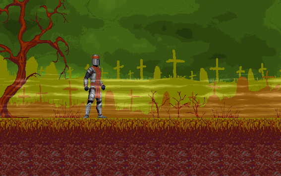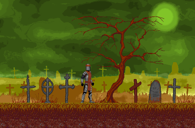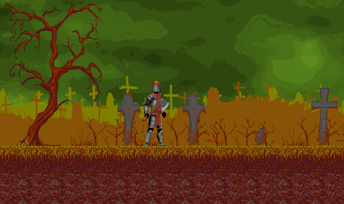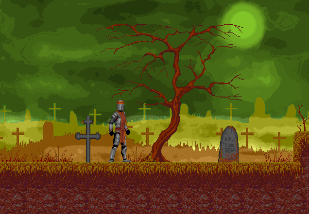 The ground tiles are excellent, as well as the main character, what I stated earlier, but I do think the tree is a bit awkward in shape in the graveyard scene, as well as the objects in the background. The crosses need more refined sillouetthes in my opinion. This is too sketchy. Those grave stones in front of the first graveyard image also have the same problem. Unrefined shapes.