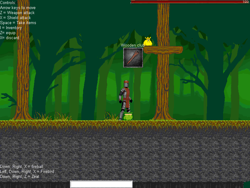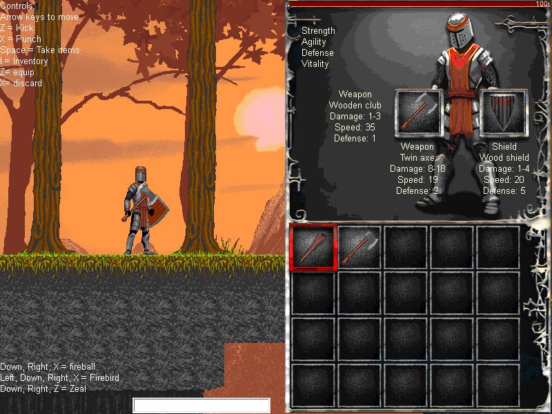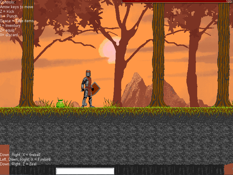 the game doesnt have much of a story atm. only thing i have in mind is a knight trying to stop the undead king ![]() This is my first scene ive done atm it looks like his high up in the mountains. what i really want is a fancy forest. so gonna work on that. ![]() my inventory. I Have also animated that character 4 frame walk and attack on knee, standing and jumping. He can also attack with his shield by bashing, standing on knee and jumping. Special moves Zeal multi attack and firebird does upward attack hitting the enemy upwards hitting several times. Plans are to make a map were you travel on your quest. Also if you have any ideas about the game story or grafics or any suggestions. anyway this is how far ive come. i find it pretty hard to work with windows 256 colors. but im gonna try my best. =) |
