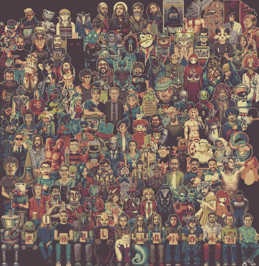 The first sitting row is reserved for the mod team only, and all users will take their standing spots in subsequent rows above. On the day of launch, only the second row is open, but we will unlock new spots while your submissions are filling in. Rules: 1) The mandatory palette is Fading 16 by CopheeMoth. 2) Claim your spot on the PJ forum the same way as ISO collab tiles are claimed - the first comment takes the spot. The spots differ in size (64, 72 or 80 px wide), so choose the one you will need for your art. If you don't see your preferred size available, wait for another level to unlock. If you decide that you need a different size after the claim, you can change it by releasing one that you have and claiming another. 3) Your avatar (if you are going for an anthropomorphic being) should be located in the middle of your spot, facing front, with the head in the middle. You should fit the elbows more or less above the heads of two characters from the level below you. 4) You have to present your WiP in 3 days and then a finished picture in another 11 days (14 days total). If you currently do not have time, don't claim. Others are waiting too. Don't worry, the collab will last until the end of the year. Any modifications to a finished submission are allowed only if moderators will accept them, but only in the inside of your work; the top outline, once sealed, cannot be changed. 5) If you manage to present your WiP in 3 days, but fail to finish the whole thing in two weeks you will loose your spot claim. You are able to reclaim it only if someone already didn't claim it for themselves. If that happens you will have to claim a different available spot, and adapt the bottom of your WiP to a new surroundings. 6) All top edges of the row need to be connected with a "white" border. The first person who finishes their claim decides on the shoulder height connection. If your neighbour is done before you, you have to connect yours to theirs. It is better to share WiPs with your neighbours and work in the spirit of collaboration to prevent difficult problems to solve later. 7) You cannot pass the white outline under your spot and draw on top of finished pieces from the previous row. 8) Extending your character to your neighbour's spot is allowed if your neighbour agrees to it, and mods allow it (look at Mirre's mermaid tail example). Also, working together with your neighbour with things like holding hands or a two-headed monster is allowed.