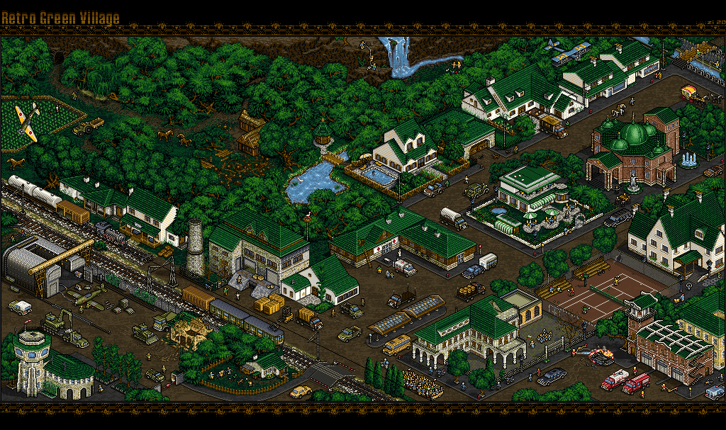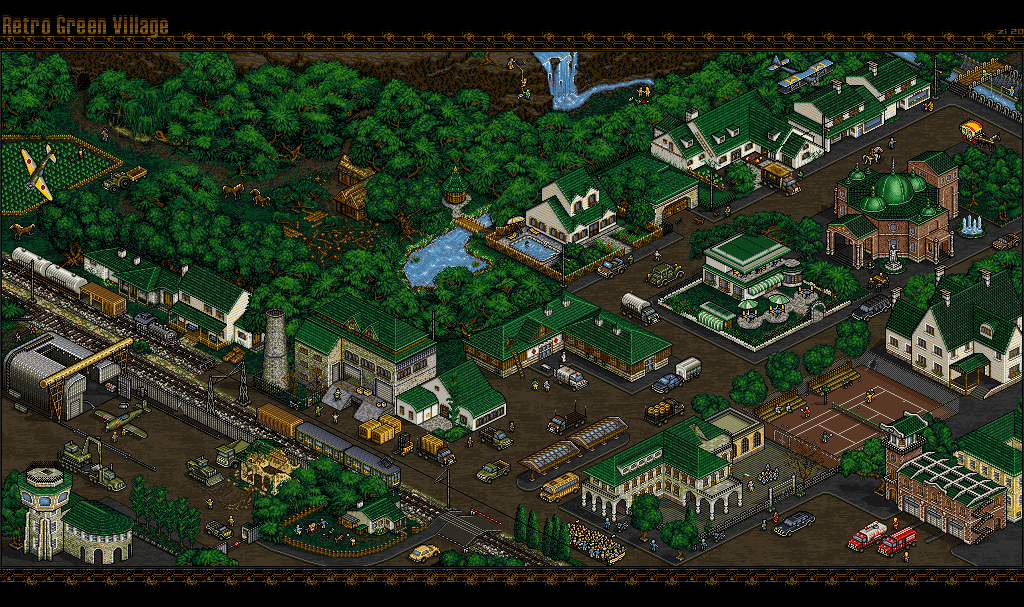 Feron I want many colours to be in green and brown gamma and just add 4 blue colours for water, 3 colours for some metal elements and 2 yellow + 2 red colours for some elements ... but when I want to make fire cars I add + 2 ekstra red :( Else I try how will look with red and grey roofs but 1st my favourite colour is green 2nd I think green carry some specific atmosphere 3rd I want to keep colours below 64. Acherhar details isn't enough - if you look in one street will understand how much details and scenes have there :) 5L1V3R plane isn't in the best direction, but I put him there because want left upper corner to have something like corner direction and in that corner I don't see much scenes which I can make ... maybe only fire in the fields :) Yep agreed jal "as much green as possible" everywhere hehehe ... why - because I watch too much ISO works as streets and towns and they are without enough trees and vegetation, but if somebody look will see that in real world have too much green :) I want all elements and details to be vissible that is why I try do not cross visible areas with vegetation :( Also I try every small character to have some employment in some small scene :) Also I try don't repeat elements more than twice, of cource some elements as telegraph pole try to put in different right points but to be vissible different parts ! else here is some update where I repair too much details and add more ... and try to repair some colours and to repair contrast ! ... I think that I'm near to finish that size !