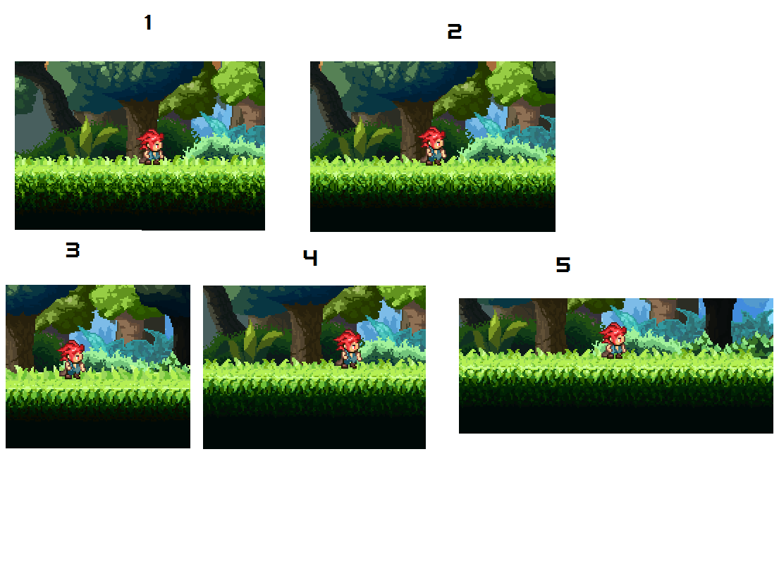 BTW I note in your 1-5 grass pictures that the character looks like they are hovering or pushed back toward the background because of where their feet touch the grass. I think bringing the character a few pixels down into the "middle" of the "flat" grass surface area would help make them look more grounded in the center of the walking space. Also a semitransparent shadow might help show the character is touching the ground. |