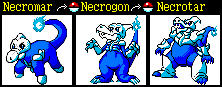 Necromar is Ghost type/Dark pokemon.Sometimes seen roaming grave yards Necromar's body is made of the bones of other pokemon.The Evolved form of Necromar is Necrogon which develops Dragon-type traits due to new bones it absorbs to grow.The Final form is Necrotar which can have variable traits depending on where it evolves. |