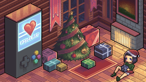 Your pallete seems a little extreme to my opinion, always need to try to control that a little better, out of the 100 in there(I checked, and there were 100, not 99) ALWAYS consider using one of your current colours before you go using a new one. That and, on pixeljoint you don't need to resize your canvas to make it bigger because we already have a zoom button. Other than those minor boo boo's, I love the warm feeling towards this great christmas piece.