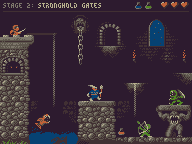 So here we go... Draw a screenshot from a fictional 2D platformer released for the PJ System console. As a reference, think of games like Castlevania, Metroid, Myth, and plenty of others. Note that your screenshot should depict a regular level scene (not an intro screen or a final boss battle).