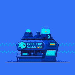 This artwork features a sci-fi, futuristic visual concept: an underwater shop run by an octopus shopkeeper who sells fish.