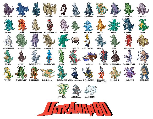 All the kaiju and aliens of Ultraman 80! Vaguely based on Keitai Denjuu Telefang sprites but I dunno if it really comes across lol